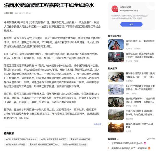 中新網(wǎng)重慶3月31日電 (記者 劉相琳)31日,重慶市歷史上投資最大、涉及面最廣、受益人口最多的重大民生水利工程——渝西水資源配置工程(以下簡稱渝西工程)嘉陵江干線全線通水。
