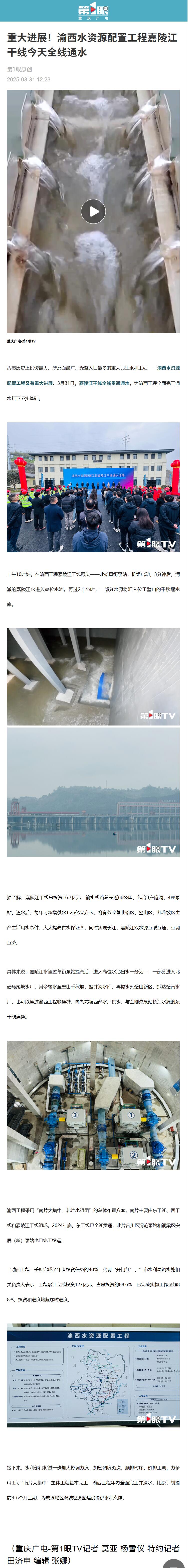 重慶廣電-第1眼TV? ?我市歷史上投資最大、涉及面最廣、受益人口最多的重大民生水利工程——渝西水資源配置工程又有重大進展。3月31日,嘉陵江干線全線貫通通水,為渝西工程全面完工通水打下堅實基礎(chǔ)。